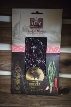 Sastāvdaļas:brieža gaļa-95, 2%, sāls, konservants E250, garšvielu maisījums mainīgās proporcijās (kadiķu ogas, koriandrs, pipari), dekstroze, cukurs, antioksidants E301, konservants E252.Uzturvērtība 100g produkta: Enerģētiskā vērtība 766/ 181 kJ /kcal. Tauki 3, 1g, tostarp piesātinātās taukskābes 1, 5g; ogļhidrāti 0, 9g, tostarp cukuri 0, 5g; olbaltumvielas 37, 4g; sāls 6, 6g. Ražotājs: SIA „Margret” gaļas pārstrādes cehs, Viestura iela 35, Jēkabpils
