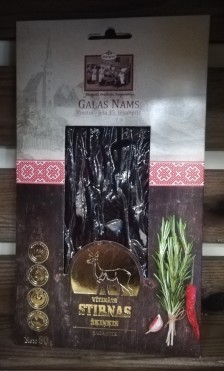 Sastāvdaļas: stirnas  gaļa-95, 2%, sāls, konservants E250, garšvielu maisījums mainīgās proporcijās (kadiķu ogas, koriandrs, pipari), dekstroze, cukurs, antioksidants E301, konservants E252.Uzturvērtība 100g  produkta: Enerģētiskā  vērtība 818kJ/ 194kcal. Tauki 3, 5, tostarp piesātinātās taukskābes 0 g; ogļhidrāti  1, 0g, tostarp cukuri  0, 5g; olbaltumvielas 39, 6g; sāls 7, 0g. Ražotājs: SIA „Margret” gaļas pārstrādes cehs, Viestura iela 35, Jēkabpils