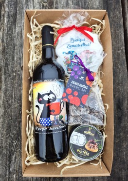 Sastāvs: Upeņu karstvīns ar kaķu puiku 13% 0, 75l, Brieža gaļas pastēte ar dzērvenēm 100g, Ziemas garšas marmelāde 150g, Cepums "Apsveikuma kartiņa" rūķi auto apaļa