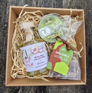 Sastāvs: Ķiploku uzlējums 0, 2l 40% , Ābolu-kanēļu marmelāde 150g, Pīļu aknu pastēte ar šitaki sēnām 100g