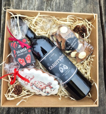Sastāvs: Mr.Plūme Upeņu, ābolu karstvīns 0, 75l 11, 5%, Sildošā marmelāde ar kajenas pipariem 150g, Rudzu piparkūkas ar balto šokolādi 180g, Cepums "Apsveikuma kartiņa" rūķis ovāla
